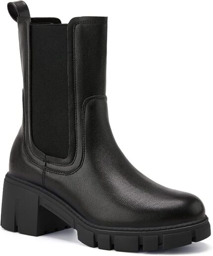 Women’s Mid-Calf Platform Chelsea Boots with Chunky Block Heel – Black Slip-On Booties
